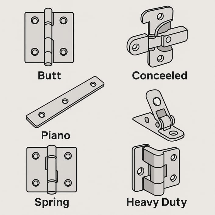 Butt Hinge | Doors, gates | Strong, simple, easy to install | Visible, limited adjustment |