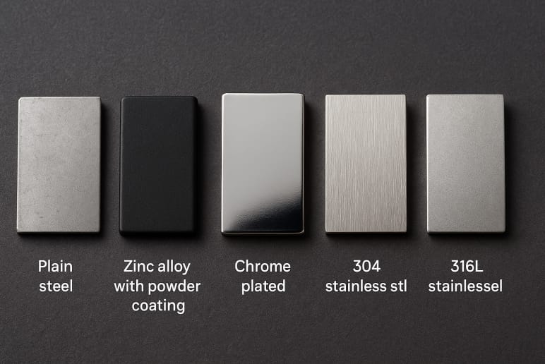 The metal decides how long a hinge will last. 316L stainless stands up to salty air and chemicals better than standard 304, while zinc alloy with powder coating works well for everyday cabinets and light outdoor use. A good rule: if a hinge can handle 500+ hours of salt spray testing (ASTM B117 or ISO 9227) without rust, it’s built for tough conditions.